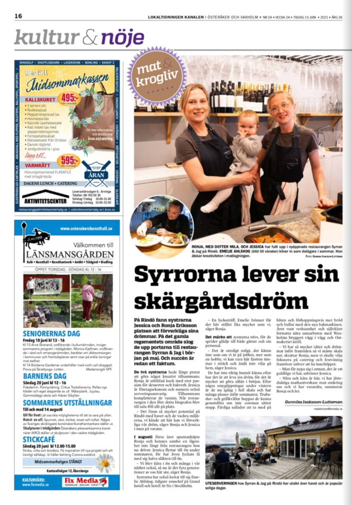 I nummer 24 av lokaltidingen Kanalen har jag bidragit med ett reportage om nystartade restaurangen Syrran & Jag på Rindö. Supermysigt ställe som jag rekommenderar att göra en utflykt till i sommar. Intill ligger Waxholms bryggeri och Ostmakeriet med hantverksmässiga ostar. För dig som vill ha god mat mellan baden, havsutsikten och skärgårdsvandringarna!