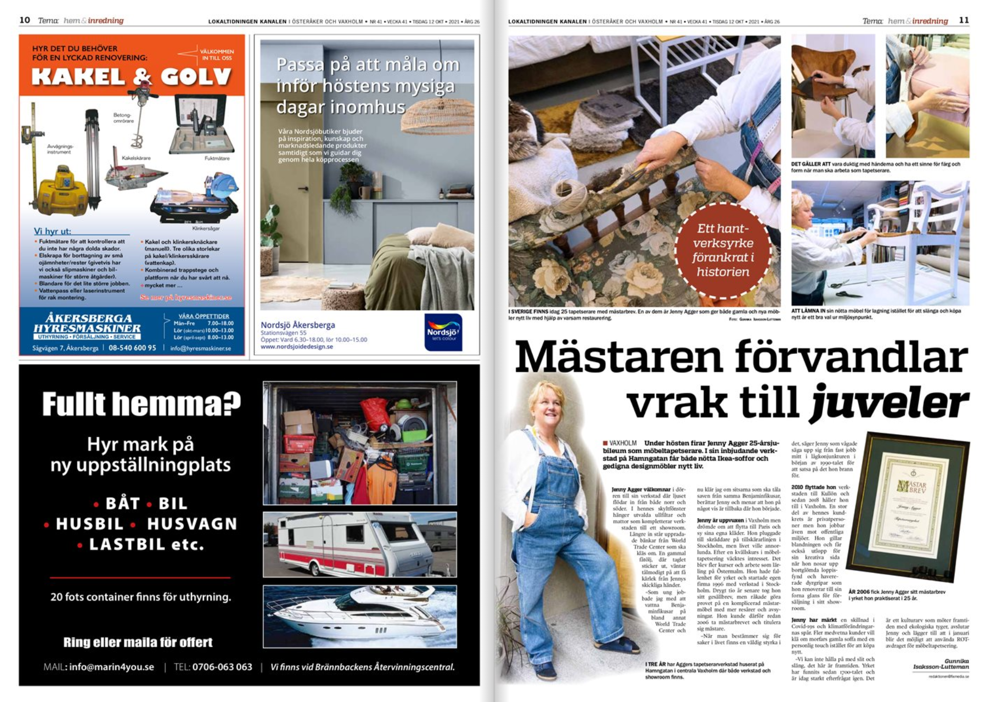 Ett historiskt yrke som kommer få större betydelse i framtiden, istället för slit och släng är det dags att styla om gamla möbler för miljöns skull. Jenny Agger har också en trevlig heminredningsbutik i Vaxholm.
