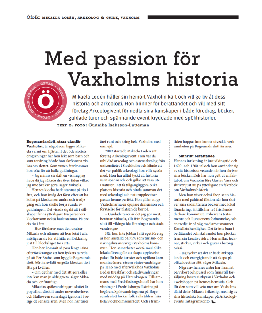 I Magasin Skärgårds vinternummer nr 3-2022 har jag skrivit ett reportage om Mikaela, en engagerad arkeolog som gärna vill berätta om Vaxholms historia för de som är nyfikna och vill lära sig mer!